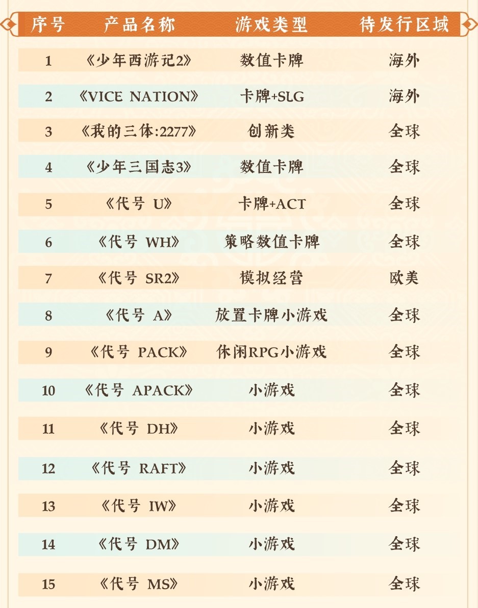 首款《三体》IP正版授权游戏《我的三体::2277》已开放预约,,,另有现代都市题材SLG《Vice Nation》、、少年系列重磅新品《少年三国志3》、、、模拟经营全平台游戏《代号::::SR2》等产品储备。。。此外在小游戏赛道上,,,,《代号 A》《代号 Pack》《代号 DH》等也将陆续开启测试,,,伴随多款新品的陆续上线有望进一步撬动增长空间。。